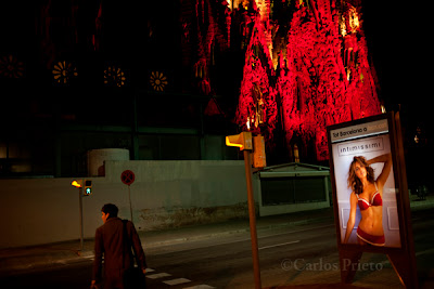 La gente se quedaba enbobada mirando la fachada del nacimiento diseñada por Gaudí, por el sorpresivo color. Una chica hablaba por el móvil, será por la proximidad de la Navidad.
